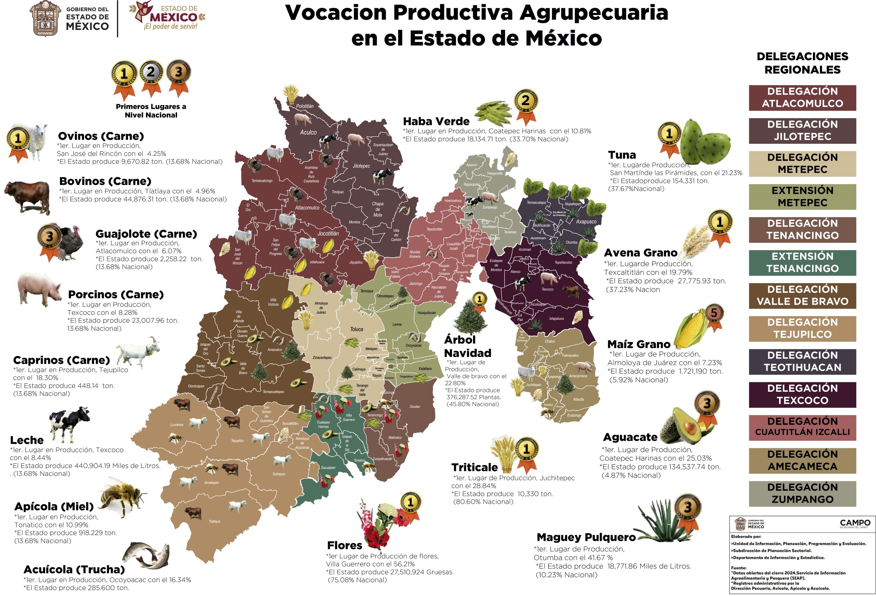 El campo mexiquense desempeña una función básica en la estructura económica y social, por ello la agricultura en la entidad enfrenta grandes retos, buscando caminos para transformarse en una actividad más redituable que produzca un cambio profundo en la sociedad rural mexiquense y atender así la demanda de una población cada vez más numerosa y favorecer de esta manera el desarrollo y bienestar de la población. Cabe señalar que en el Estado de México a nivel nacional son principales productores de tuna, haba verde, triticale, entre otros, así mismo, el segundo lugar en avena grano y tercer lugar en producción de aguacate junto con maguey pulquero, además, uno de los mayores productores de flores y plantas ornamentales del país; el Estado cuenta con 738,069.06 hectáreas cosechadas con un valor de producción de 33,699.37 millones de pesos.
